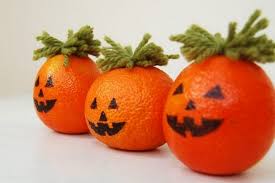 2-Laranjas abóboras: Nome confuso né?Eu fiquei sem saber do que chamar isso.Na verdade são laranjas que imitam abóboras 'cabeludas'.É só fazer o rosto,com um molde,de preferência,e depois colar barbantes coloridos na extremidade.Não se esqueça de aproveitar a laranja depois,rsrsrs.