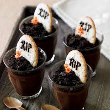 E com vocês,a melhor parte da coisa.Quem não tem uma pequena queda pelos doces de halloween?O melhor de tudo,é que eles são bem simples e práticos de fazer.Na primeira imagem são bolinhos de vários tipos: Com granulado,do tipo ''Cupcake'' e com essas plaquinhas em cima (Não sei dizer o que é).Já na segunda,são copinhos plásticos com mousse de chocolate dentro,e colocaram um biscoito com ''RIP'' escrito...ótima ideia pra quem não sabe fazer muita coisa na cozinha.